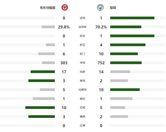 第31分钟福登接到队友倒三角传中后,获得了无人盯防的绝佳射门机会,可惜他的打门偏得离谱,直接飞出了底线,半场比赛结束前,赖因德斯右路的凌空斩威胁十足,但被布伦特福德门将单拳托出横梁,没有让分差被进一步拉大。