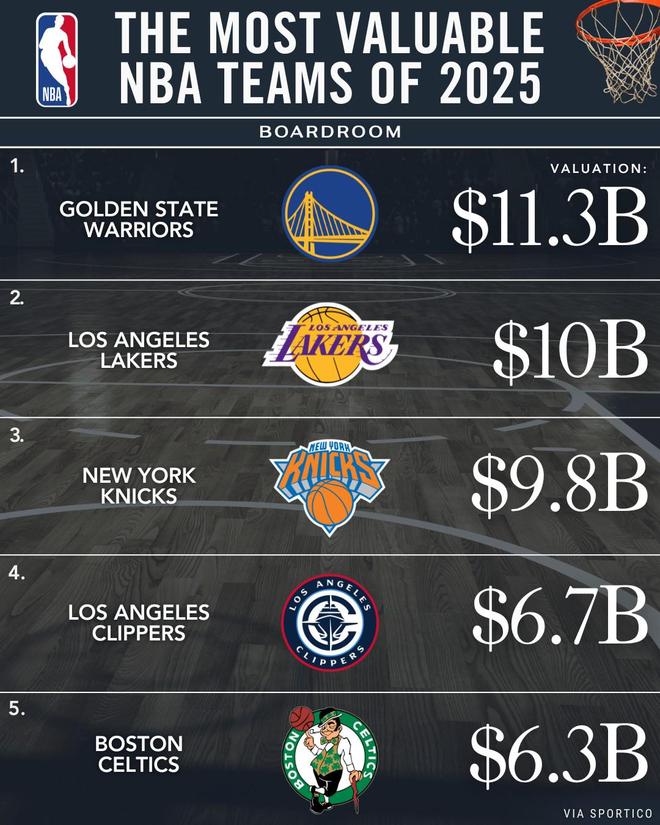 - NBA | NBA最新市值排行:勇士113.3亿美元领跑30队平均市值55.1亿