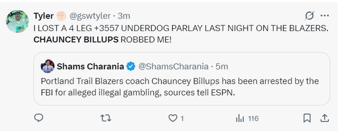 根据Tome Winter的跟踪报道,比卢普斯因为涉嫌非法赌球被捕,两位高级执法官员明确表示,昌西被捕不是参与他自己执教的比赛。(此事在全美范围内掀起轩然大波,因为几分钟之前Shams刚刚报道罗齐尔因为赌球被FBI带走)