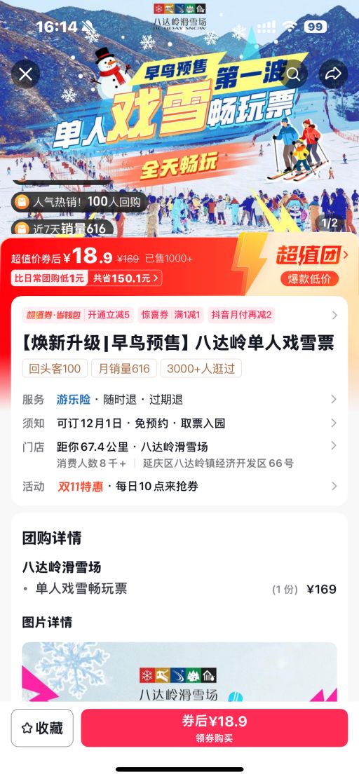 以滑雪热门地河北张家口为例,近几年当地滑雪场数量大幅扩容,竞争愈发激烈,多家雪场纷纷下调价格,百元内就能拿下门票,和此前两三百元的定价形成鲜明对比。一些其他雪场甚至在团购平台上推出19.9 元、29.9元的超低价雪票,堪称“白菜价”体验。