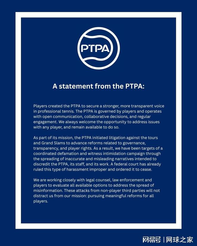 声明中写道:“作为使命的一部分,PTPA对巡回赛组织和大满贯赛事提起诉讼,以推动与治理、透明度和球员权益相关的改革。正因如此,我们成为了一场有组织的诽谤和证人恐吓行动的目标,通过传播不准确、具有误导性的叙事,意在抹黑PTPA、其员工以及我们的工作。”