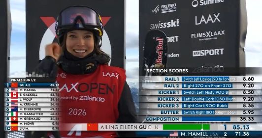 此次莱克斯站决赛只有两轮滑行机会,取成绩最高的一轮分数排名。谷爱凌在第一轮滑行中就拿到了85.13分,这一分数也是当日全场最高分。